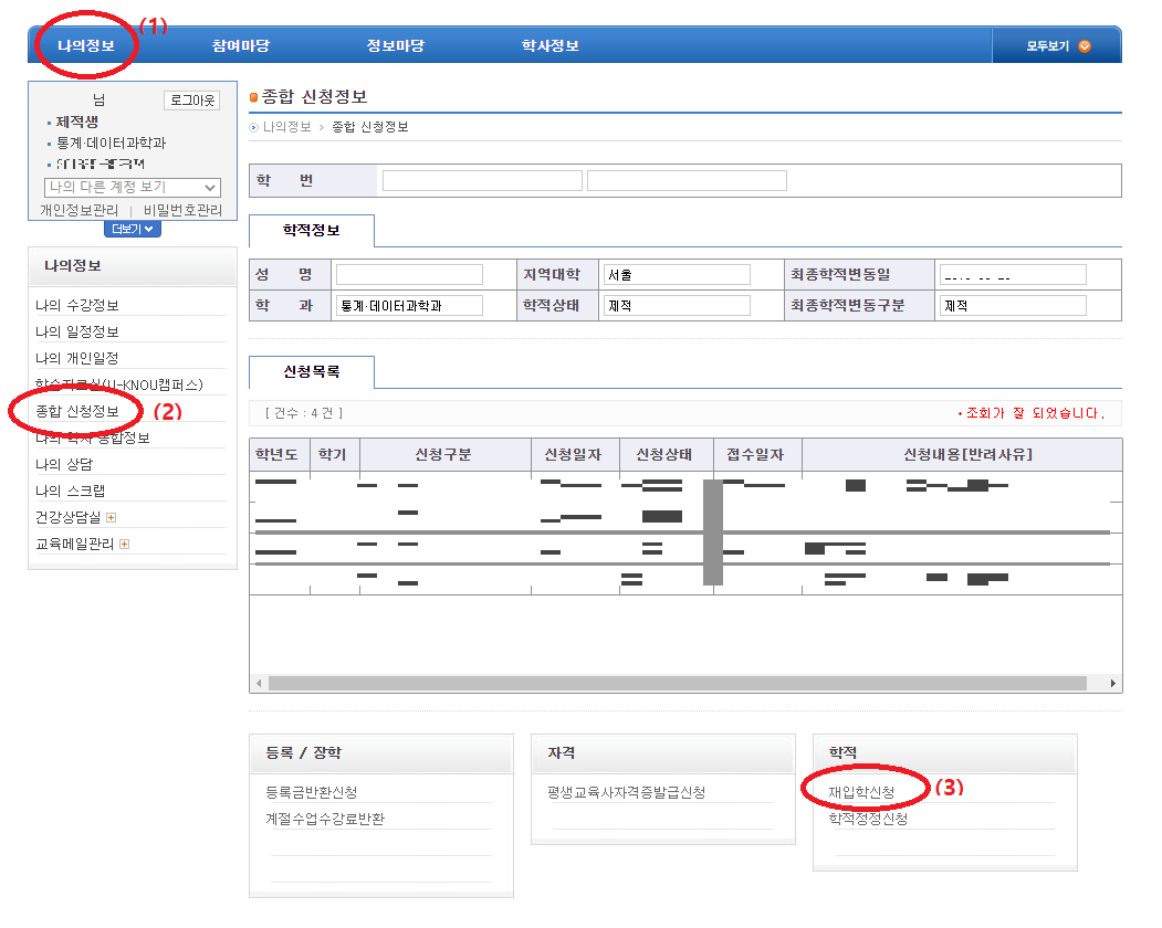 (3) 화면 오른쪽 하단 구석의 학적 카테고리에서 [재입학신청]을 선택한다