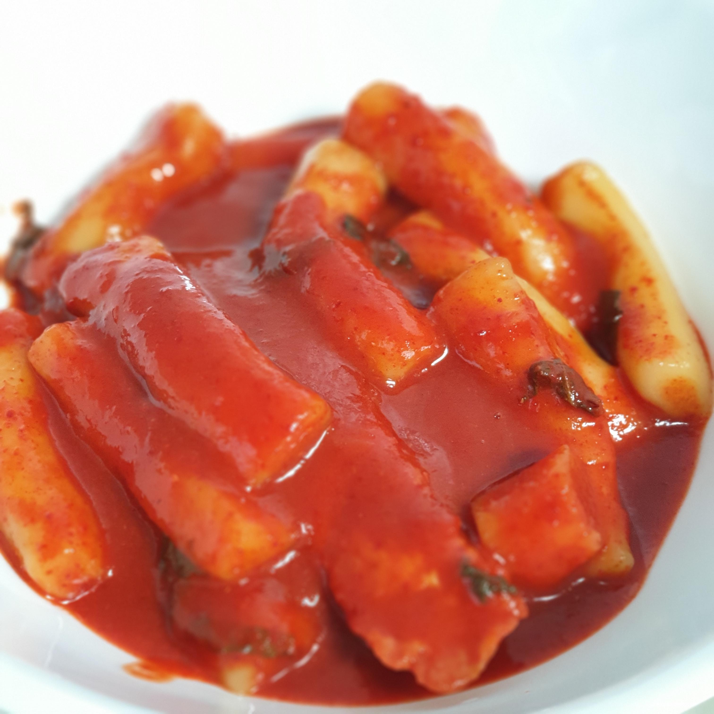 똑같이 두꺼운 밀떡 베이스에 매운 양념, 그리고 깻잎이 특징이다.